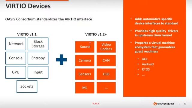 Software Define Architecture in a Car: Using VIRTIO to Change the Way Car Software is Developed - Tero Salminen, OpenSynergy GmbH Discussion about How the concepts of software defined architecture can be used in a car. And How VIRTIO fits to this? Software defined architecture is coming from cloud but it can with some modifications be used in the car also especially in the future when the new technology makes it easier to combine SoCs and peripherals in more flexible way. AGL is adopting VIRTIO that can be used more widely with the concepts of the software defined architecture to form a new kind of car platform and ecosystem for both software and hardware. For more info see: https://www.automotivelinux.org/