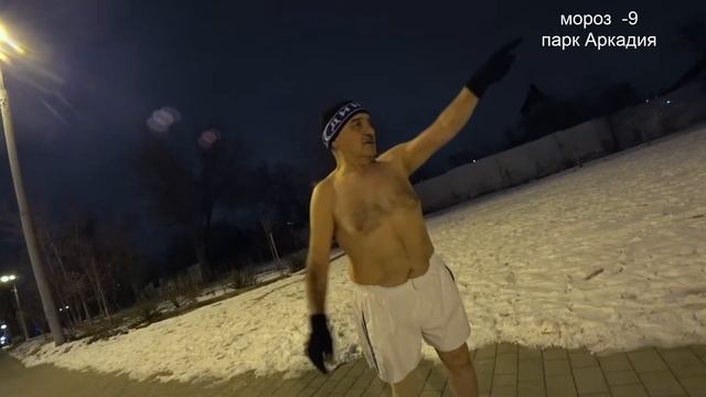 70-ти летний астраханец по морозу с голым торсом.