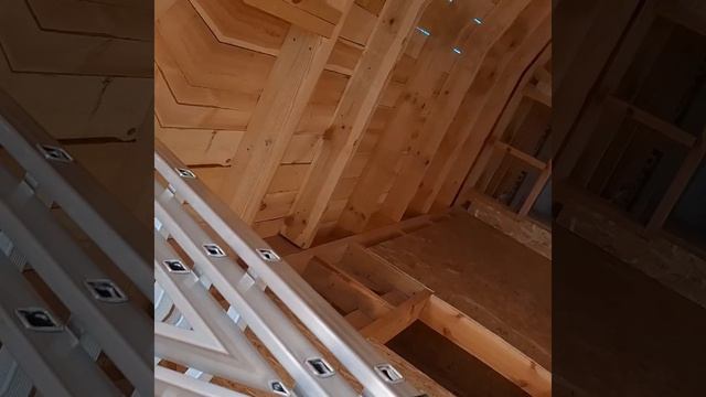А dog named Jesse, a half-breed Akita Inu and a German Shepherd, looks at the retractable ladder in the A-frame house (Собака по кличке Джесси, метис пород Акита-ину и Немецкая овчарка, смотрит на выдвижную лестницу-стремянку в доме А-фрейм)