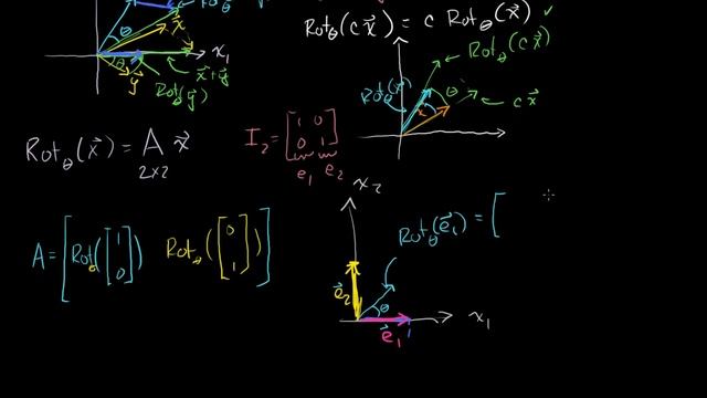 Linear Transformation Examples: Rotations in R2 Watch the next lesson: https://www.khanacademy.org/math/linear-algebra/matrix_transformations/lin_trans_examples/v/rotation-in-r3-around-the-x-axis?utm_source=YT&utm_medium=Desc&utm_campaign=LinearAlgebra Missed the previous lesson? https://www.khanacademy.org/math/linear-algebra/matrix_transformations/lin_trans_examples/v/linear-transformation-examples-scaling-and-reflections?utm_source=YT&utm_medium=Desc&utm_campaign=LinearAlgebra Linear Algebra on Khan Academy: Have you ever wondered what the difference is between speed and velocity? Ever try to visualize in four dimensions or six or seven? Linear algebra describes things in two dimensions, but many of the concepts can be extended into three, four or more. Linear algebra implies two dimensional reasoning, however, the concepts covered in linear algebra provide the basis for multi-dimensional representations of mathematical reasoning. Matrices, vectors, vector spaces, transformations, eigenvectors/values all help us to visualize and understand multi dimensional concepts. This is an advanced course normally taken by science or engineering majors after taking at least two semesters of calculus (although calculus really isn't a prereq) so don't confuse this with regular high school algebra. About Khan Academy: Khan Academy offers practice exercises, instructional videos, and a personalized learning dashboard that empower learners to study at their own pace in and outside of the classroom. We tackle math, science, computer programming, history, art history, economics, and more. Our math missions guide learners from kindergarten to calculus using state-of-the-art, adaptive technology that identifies strengths and learning gaps. We've also partnered with institutions like NASA, The Museum of Modern Art, The California Academy of Sciences, and MIT to offer specialized content. For free. For everyone. Forever. #YouCanLearnAnything Subscribe to KhanAcademy’s Linear Algebra channel:: https://www.youtube.com/channel/UCGYSKl6e3HM0PP7QR35Crug?sub_confirmation=1 Subscribe to KhanAcademy: https://www.youtube.com/subscription_center?add_user=khanacademy