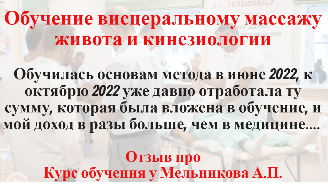 Обучение висцеральному массажу живота и кинезиологии. Отзыв Ольга, 56 лет, врач, ушла из медицины, о курсах Мельникова А.П.: “..... Обучилась основам метода в июне 2022, к октябрю 2022 уже давно отработала ту сумму, которая была вложена в обучение, и мой доход в разы больше, чем в медицине…. “. «Готовясь к пенсионному возрасту, я задумалась о том, чем я буду заниматься на пенсии и мои мысли привели меня к прикладной кинезиологии и висцеральному массажу живота. Школу Мельникова А.П. я выбрала случайно, но абсолютно не сожалею, поскольку Александр Петрович прекрасный специалист, педагог и его занятия очень положительно отозвались во мне, была дана практика на курсе и абсолютно новый материал для меня усваивался очень легко, там, где было непонятно все разъяснялось буквально на пальцах. Симптомы заболеваний в моем организме, в организме моих сокурсников на курсе были уничтожены. Я познакомилась с замечательными специалистами. Обучилась основам метода в июне 2022, к октябрю уже давно отработала ту сумму, которая была вложена в обучение, и мой доход в разы больше, чем в медицине. Дальше, я думаю, дальше будет лучше. Я волновалась, переживала, что вдруг я не найду клиентов, но после превосходных результатов сработало «сарафанное радио» и сейчас я работаю успешно. Я была в восторге от кругозора Александра Петровича, как педагог он настолько универсальный во всех познаниях, областях нашей жизни, что давало еще больший стимул к общению с ним, заинтересованность его курсом и к познанию того, чему он нас учил. Участие в этом курсе я бы порекомендовала молодым людям, которые не могут себя найти в профессии, в материальном обеспечении. Каждому, кто заинтересован в своем здоровье, здоровье своих близких, обязательно должны прийти на курсы Мельникова А.П., и они смогут найти себя в этой профессии» Подробный отзыв- в видео. Много интересного! ✅ Подробнее про обучение кинезиологии и висцеральному массажу живота и бронь места на курсе https://ruszdrava.ru ✅ Связаться с менеджером и задать вопросы про обучение на курсах: +79222160707