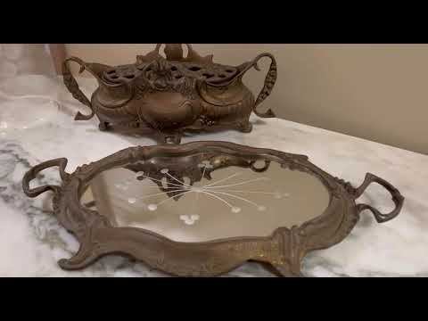Ароматница или роузбол - https://gallerique.ru/the-culture-of-everyday-life/tproduct/953180058571-aromatnitsa-ili-rouzbol Старинный предмет, который используется как ваза для бутонов. Можно также применять как вазу для небольших цветов или как подставку под кисти и канцелярию. В комплекте к ароматнице идет фигурный зеркальный поднос в обрамлении из бронзы и с рисунком в технике травления стекла. Ароматница Длина: 26 см Ширина: 10 см Высота: 11 см Поднос Длина: 34 см Ширина: 20 см Высота: 3 см Состояние: отличное, зеркало без нюансов Страна производителя: Франция Период: первая половина XX века