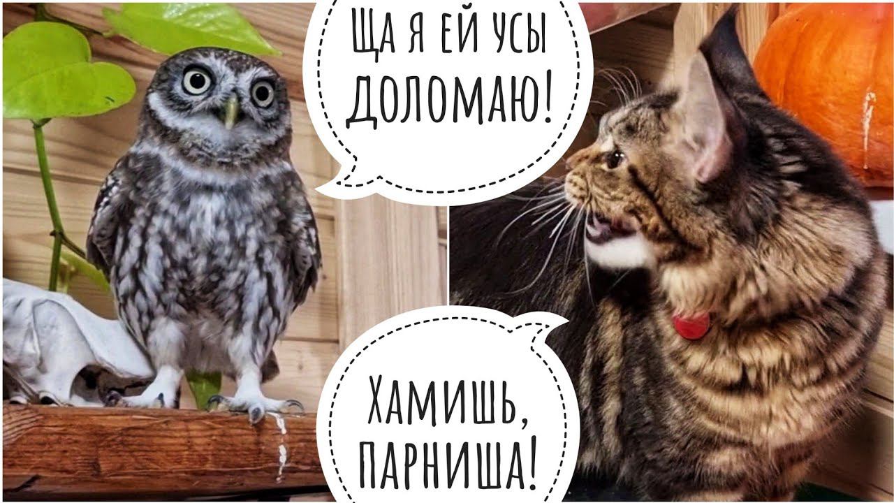 Тридцать первый день октября выдал нам утреннего пушистого снега и шквального ветра. Кошка Морошка очень удивилась погодным условиям и помчала за мной в совешню. Она уже забыла, как там бывает интересно. А сыч Лучик не забыл, что не звал к себе кошку Морошку, и высказал всё, что думает по этому поводу, как только снова обрёл дар речи. Сова филин Ёль не очень рада. Она любит снег, но не любит, когда ветер в лицевой кружок этот снег сыпет. #owlhouse #owl #cat