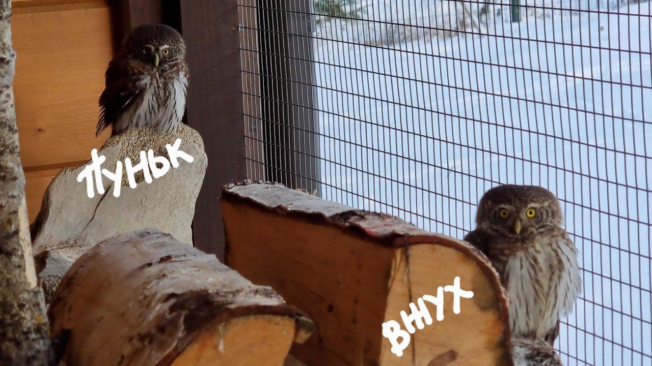 Сычик Вжух освоилась в вольере. К кошке Морошке в гости зашёл кот Бонифаций, забрал косточку и ушёл