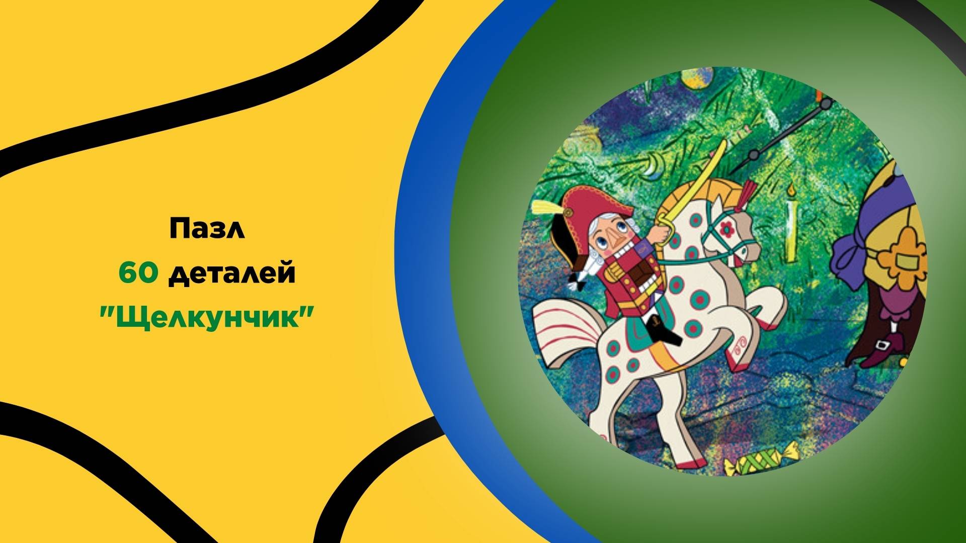 Пазл «Щелкунчик» содержит 60 деталей, из которых складывается большое яркое изображение главного момента битвы между Щелкунчиком и Мышиным королем. Размер деталей пазла ориентировочно 3,5×3,5 см, они выполнены из плотного картона и легко соединяются между собой. Размер собранного изображения - 23×33 см. Красочный пазл «Щелкунчик» обязательно понравится всем любителям этого советского мультфильма и станет отличным подарком как для мальчика, так и для девочки. Сборка такого пазла обязательно станет прекрасным способом провести время в кругу семьи или друзей в новогодние праздники. Рекомендовано для детей с 3 лет. Посмотреть подробнее: Wildberries – Артикул 19401402 С уважением, команда Степ Пазл!