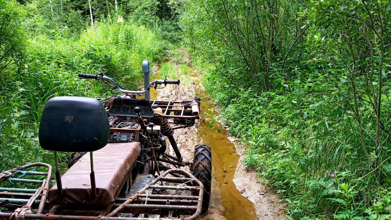 Поездка на бездорожье на самодельном квадроцикле после заливных дождей