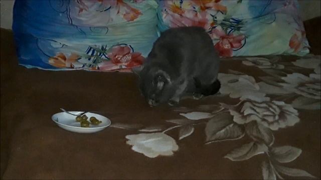 Кот ест оливки