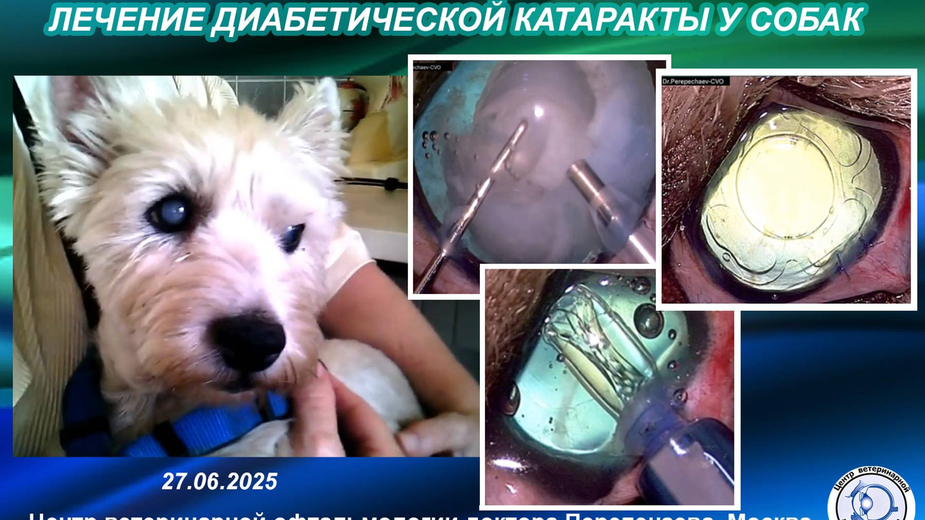 Вест-хайленд-уайт терьер, самка, возраст 7 лет поступила на прием с некомпенсированным сахарным диабетом, в очень плохом состоянии, полностью слепая по причине двусторонней диабетической катаракты. Осложняющими факторами являлось то, что собака была нестерилизована, кроме того, при УЗИ диагностике у нее была обнаружена опухоль селезенки... В течение трех месяцев собаке была подобрана инсулинотерапия, стабилизирован уровень сахара, проведена стерилизация вместе с удалением пораженной селезенки, и с интервалом три недели проведены две операции по удалению катаракты с имплантацией искусственных хрусталиков. В результате проведенного лечения собаке удалось полностью восстановить здоровье и вернуть нормальное зрение.