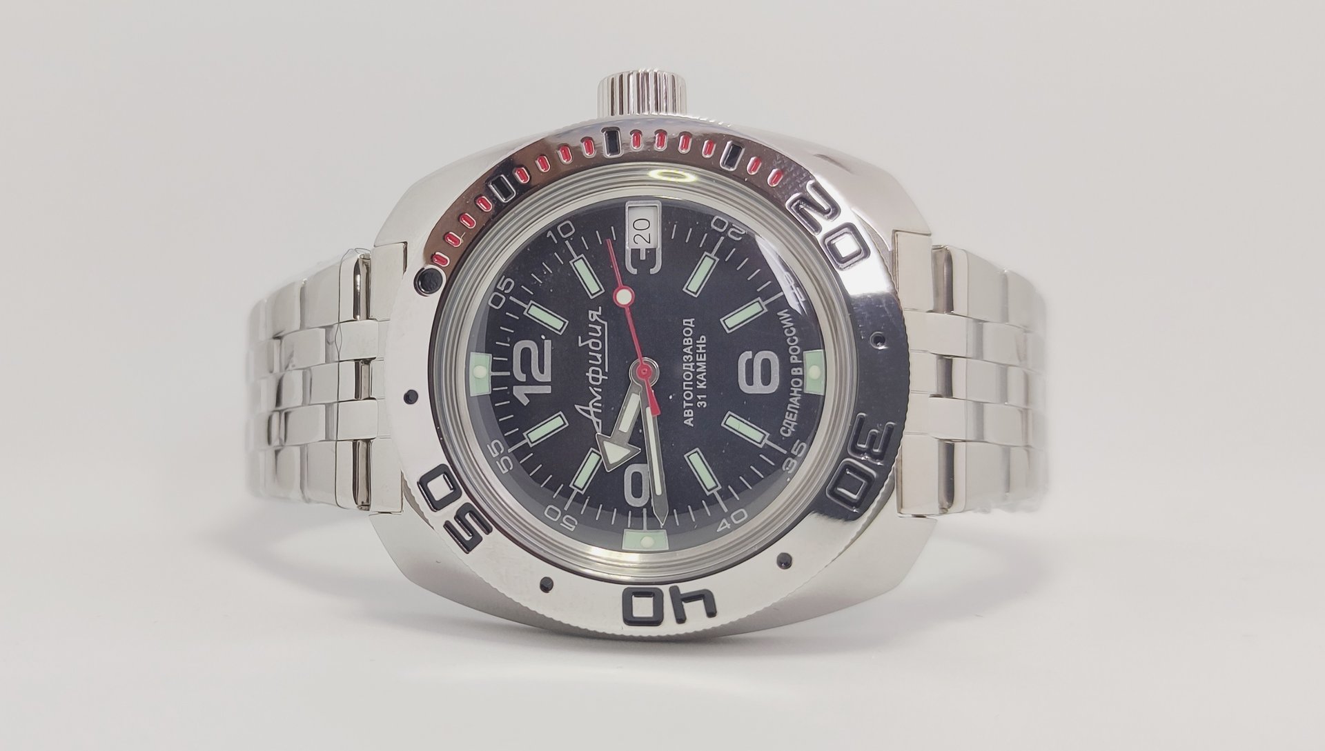 Тип часов: Механические Материал корпуса: Нержавеющая сталь Класс водонепроницаемости: 20 Bar Стекло: Пластиковое Подсветка: Да Противоударные: Да Материал браслета/ремешка: Нержавеющая сталь Страна-изготовитель: Россия Автоподзавод: Да Календарь: Да Размер: 40x40x10 мм