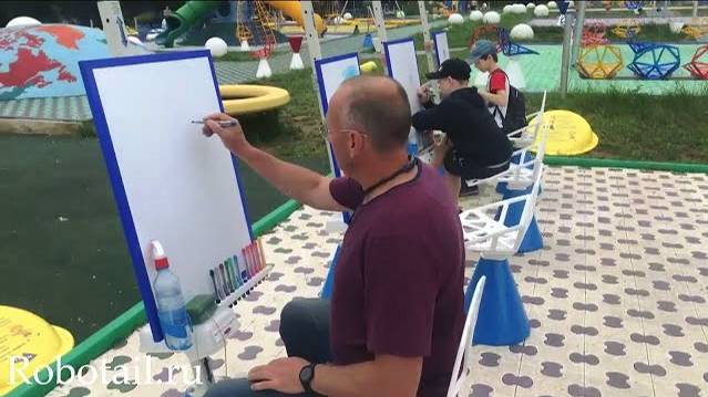 Панель для рисования покрыта пленкой, на которой хорошо рисуют и с которой хорошо стираются маркеры IKEA MALA. Этими маркерами можно делать линии разной толщины. Для очищения поверхности для рисования мольберты снабжены водой и водосгоном. Мольберты регулируются по высоте. Основанием мольберта является основание для стульев. Для целей ODA-L оно бетонируется. Мольберт легко повернуть и подвинуть, при этом он полностью устойчив. Подробнее: https://robotail.ru/p/750778398-ulichnyy-molbert/ Теги: мольберт уличный,купить мольберт уличный,оборудование для парков