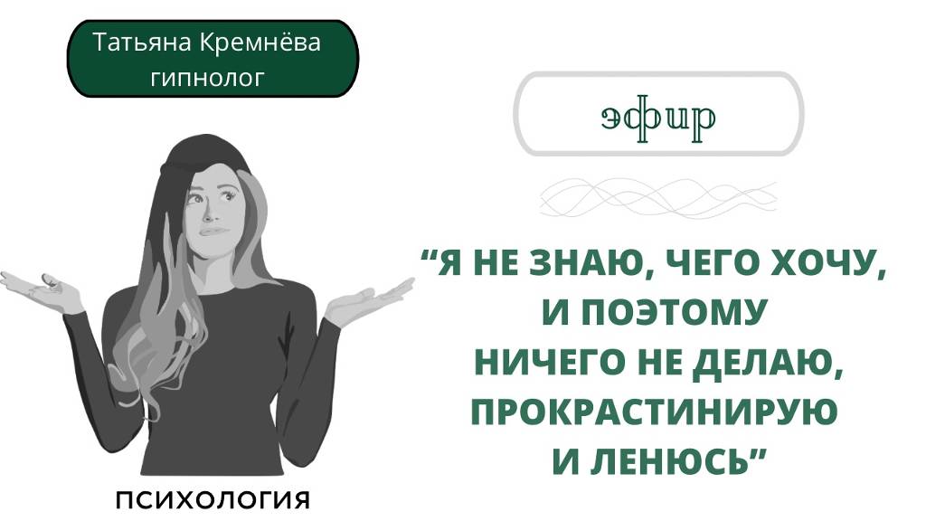 Что делать, если вы ловите себя на прокрастинации и лени? Мы часто слышим советы - отдыхать, или дисциплинировать себя, но что, если это не помогает? Какие на самом деле могут быть препятствия к достижению своих целей или причины отсутствия желаний вообще? Об этом мы говорили на эфире, обязательно посмотрите! Тема эфира: "Я не знаю, чего хочу, и поэтому ничего не делаю, прокрастинирую и ленюсь" Тайминг: 00:00 Приветствие; 01:12 Что может помочь понять, мое ли это желание (зависть); 04:10 А если мои цели слишком далеки от того, где я сейчас; 07:45 Что еще мешает понять, чего я хочу (много обязанностей); 14:18 Сепарация, можно ли не отказываться от мечты; 19:10 Препятствия внутри, особенности организма; 25:50 Что делать, если не могу понять, чего вообще хочу; 30:18 Различные препятствия, страхи, ограничивающие убеждения; 33:15 Достижение целей во вред здоровью; 35:50 Приглашение на «Карту желаний» Перейдите по ссылке, чтобы зарегистрироваться на эфир "Карта желаний" salebot.site/md/karta_zhelani #эфир #самооценка #уверенность_в_себе 📌Для личной связи со мной, предложений и личной терапии https://t.me/kremneva_t 📌Канал "Самотерапия. Кремнёва Тати. Психология, саморазвитие, гипноз, расстановки.". Здесь я провожу 1-2 раза в неделю открытые мероприятия на темы, которые я раскрываю в своих роликах. Расписание открытых мероприятий и сами мероприятия смотрите здесь: https://t.me/kremneva_tati 🤱 Свяжитесь со мной в соц.сетях. Переходите, там много пользы и поддержки: 👼🏻 Instagram: https://instagram.com/kremneva_tati 👼🏻 Telegram: https://t.me/kremneva_tati 👼🏻 ВКонтакте группа: https://vk.com/kremneva.tati #психология