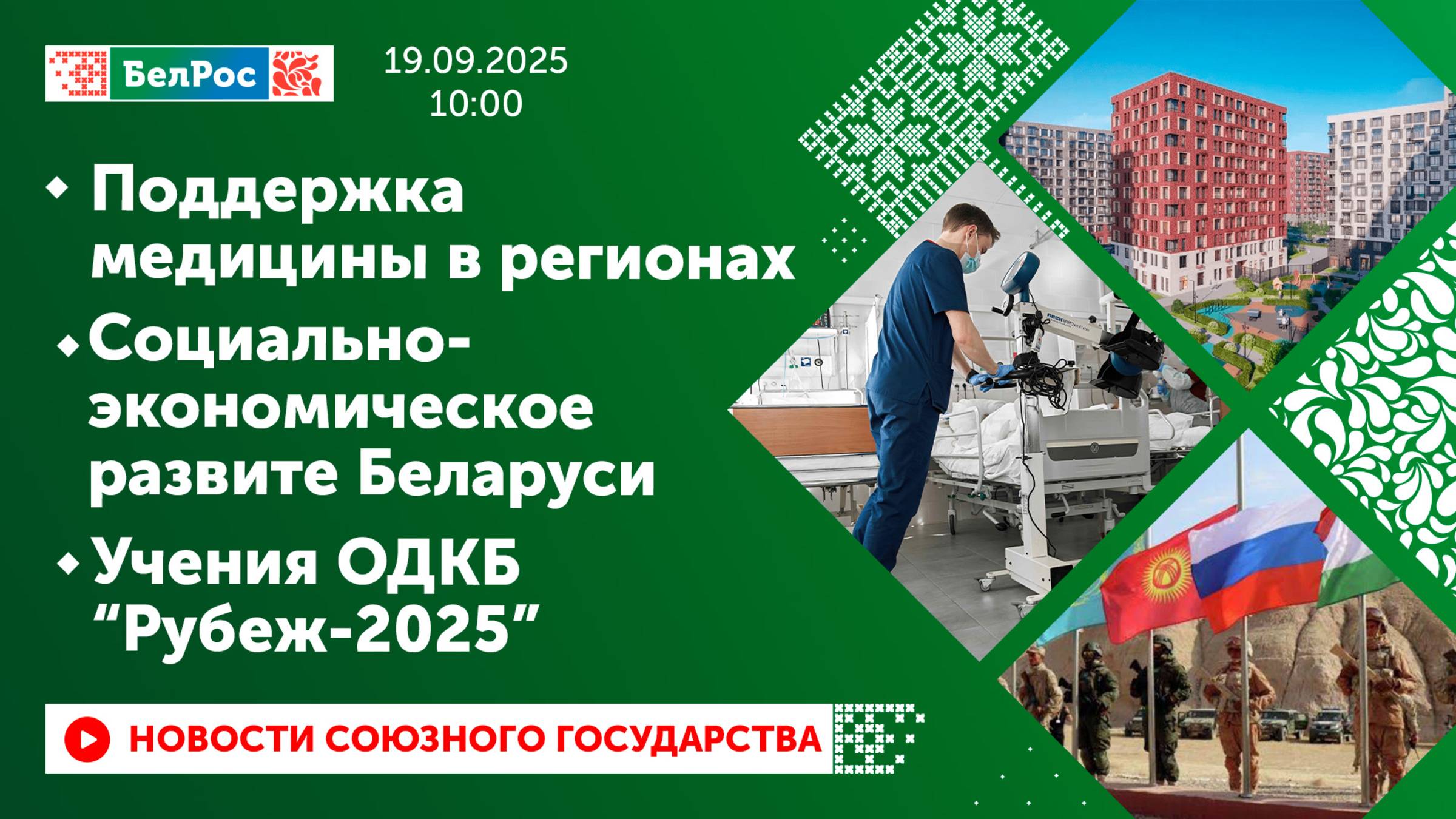 Закадровый текст озвучивает *ИИ Антон* Новости 19.09.2025 на 10:00 - Правительство России направит финансирование на развитие медицинских организаций в регионах - Проект программы социально-экономического развития Беларуси обсудили в Минске - ФСБ России задержала злоумышленников, пытавшихся совершить теракт против главы одного из оборонных предприятий России - В Киргизии стартовали командно-штабные учения ОДКБ "Рубеж-2025" - В Нижнем Новгороде проходит первый слет ВМФ-2025 Смотрите главные новости Союзного государства на телеканале БелРос. Ссылки на наши соц. сети Сайт: http://belros.tv/ Telegram: https://t.me/belrostv Одноклассники: https://ok.ru/group/55657426976918 ВКонтакте: https://vk.com/belrostv TikTok: https://www.tiktok.com/@belros_tv?_t=... RuTube: https://rutube.ru/channel/23501830/ Яндекс. Дзен: https://zen.yandex.ru/belrostvv Наши подкасты на Яндекс. Музыке: https://music.yandex.ru/album/25615251 #главныеновости #новостисегодня #СоюзноеГосударство