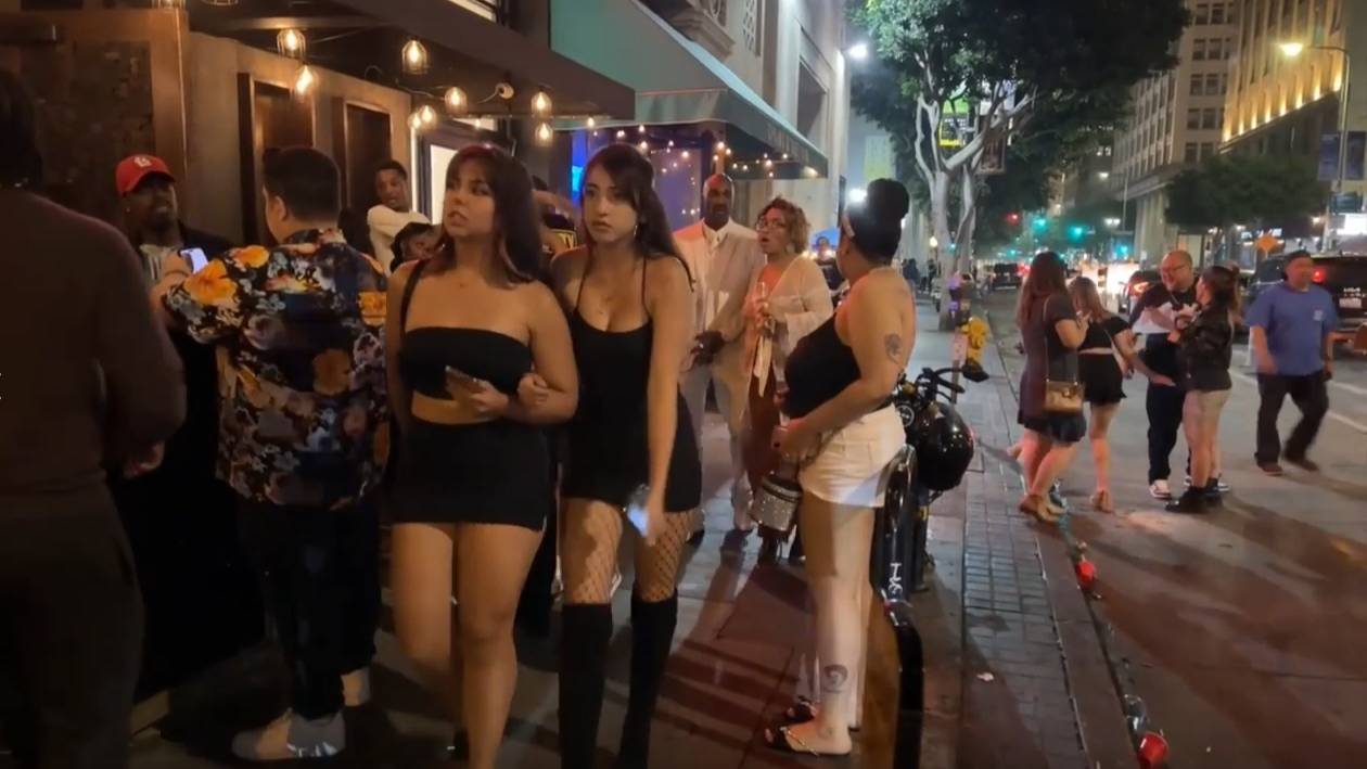 Прогулка по даунтауну и Фигероа стрит Лос Анджелеса в 1.30 после полуночи