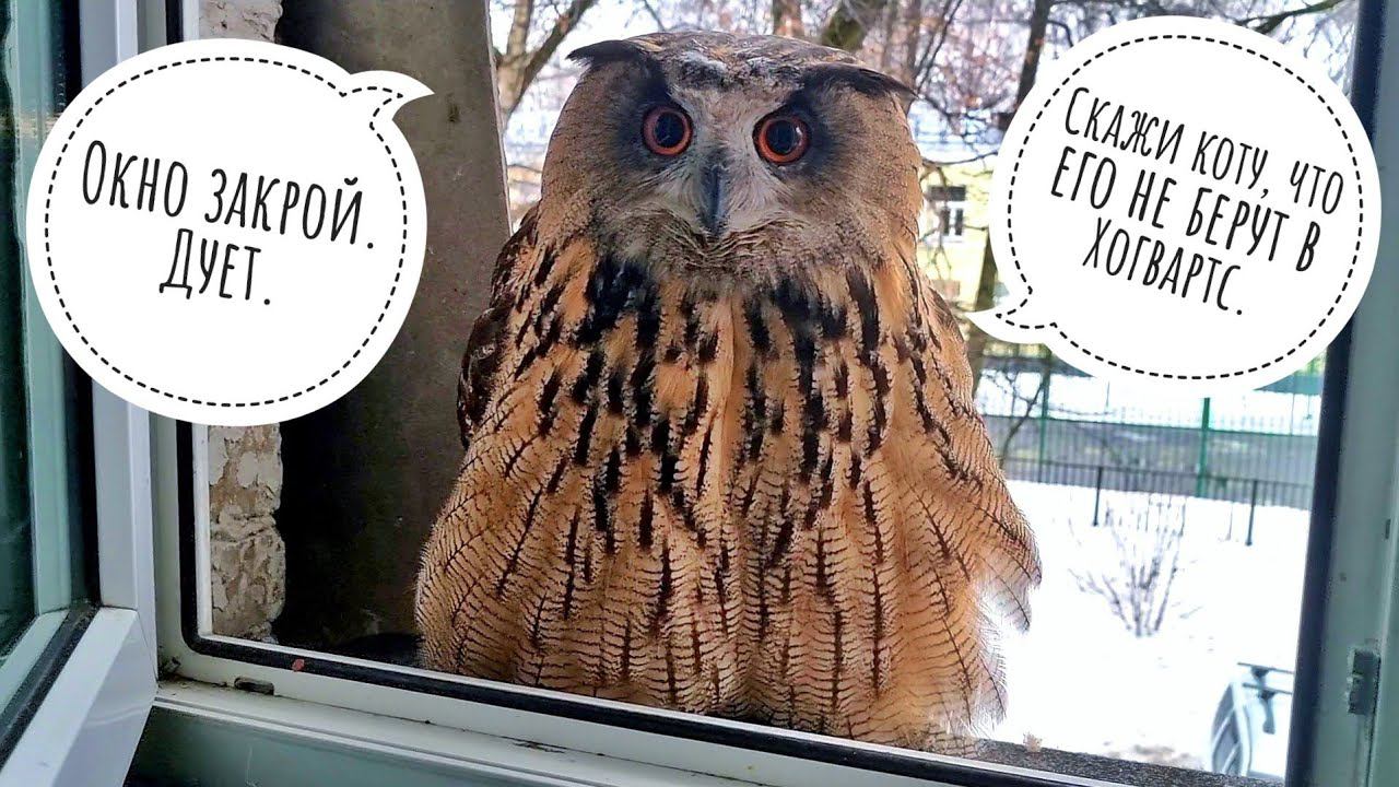 Сложно решить: вроде, ничего плохого и опасного на улице нет, но погода такая ненастная, что хочется домой. Или не хочется. Или да. Сова Ёль потом решит. Кот Мурлок для себя всё решил сразу. #owl #yoll #cat