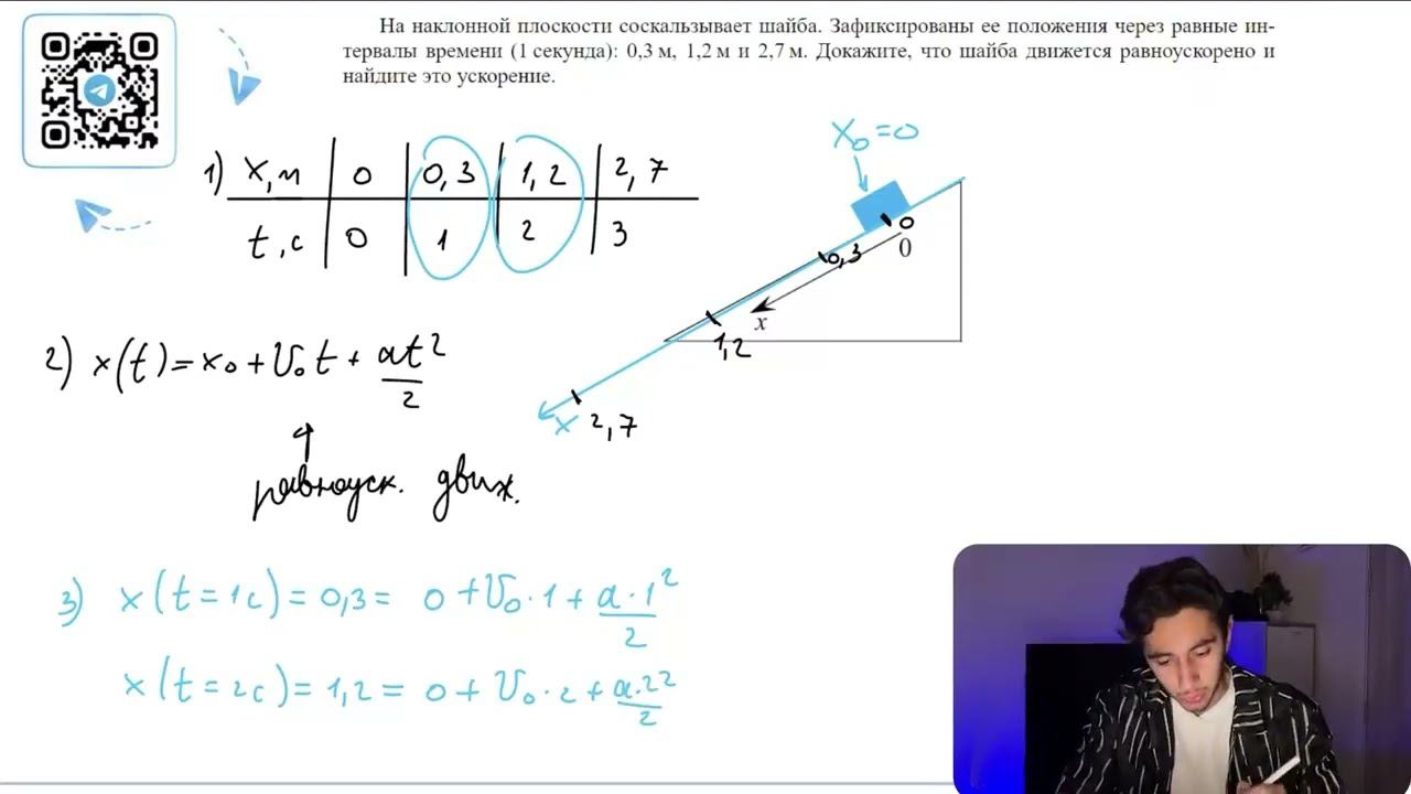 На наклонной плоскости соскальзывает шайба. Зафиксированы ее положения через равные интервалы - №