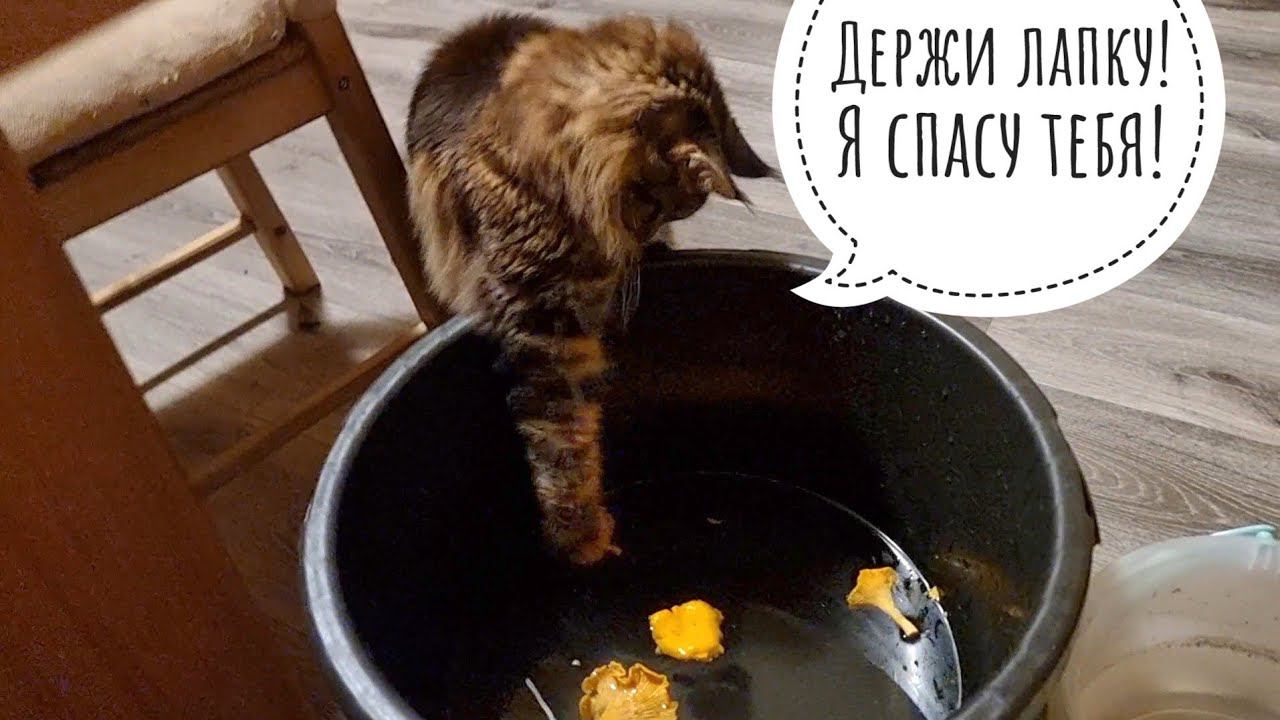 Кошка Морошка на рыбалке добыла лисичку! Ну а чего она там плавает?